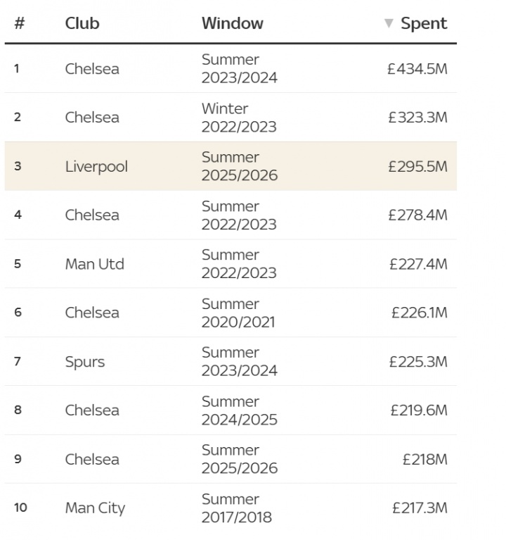 根据Sky Sports统计,利物浦在英超联赛的历史支出列表中排名第三,小于切尔西的2022-23冬季窗口和2023-24夏季窗口。